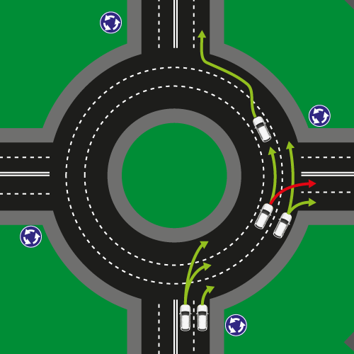 Въезд на перекресток с круговым движением аналогичен въезду на Т-образный перекресток с односторонним движением направо. Равно как и выезд с него. Просто помните об этом и будет вам щасте.