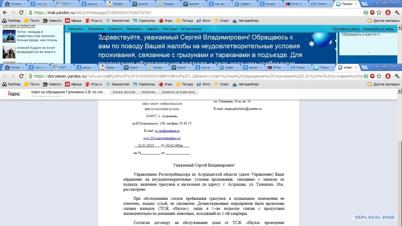 Управлением Роспотребнадзора по Астраханской области (далее Управление) Ваше обращение на неудовлетворительные условия проживания, связанные с запахом из подвала, наличием грызунов и насекомых по адресу: г. Астрахань, ул. Татищева, 16ж, рассмотрено.