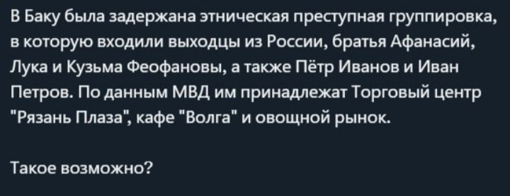 помнится, во времена 08.08.08 грузин жестоко прессовали, вот прямо повсюду.... и ОПГ грузинские брали пачками. и обысков была куча..... МВД и ФСБ сейчас разгуляются- народ даже поддержит... ждем новостей о мошенниках азерах, азерских ОПГ и просто пресупниках-азербайджанцах ...