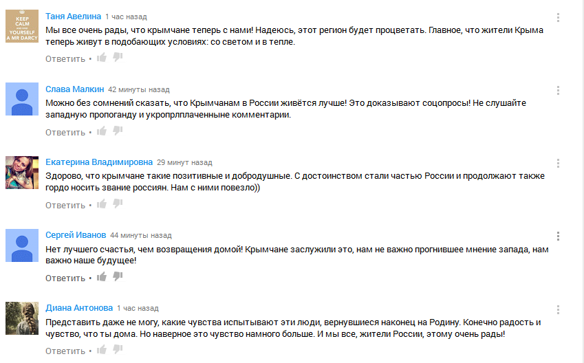 Снимите лучше ролик в нашей стране от Сибири до Владивостока, каково нам теперь живется, когда Крым наш и как мы больше не хотим туда ездить из-за охуевших цен и сколько у нас было поборов (на госслужбах) на "помощь Крыму", как сокращали единицы штатные, потому что надо было ввести их в Крыму...