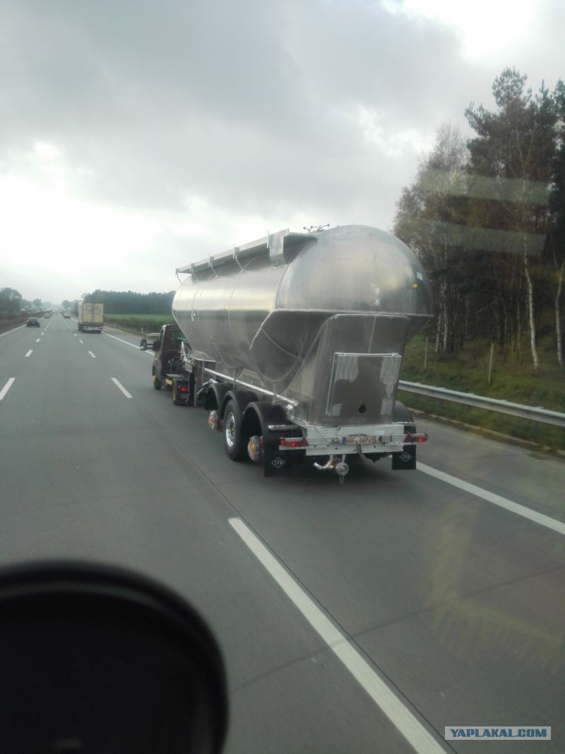 Короче, такие системы в последние год-два используют вовсю голландцы. По оськам идет как грузовик(дорожные налоги), а по весу как бусики вроде как. Точно не могу сказать грузоподьемность, но исходя из личных соображений, сам бусик идет по классификации 2,5-3 тонны, полуприцеп думаю, до 5 тонн. думаю, тянет на полный вес от 7,5 до 10 тонн. Это еще ладно, с таким полуприцепом. Заценяем, что я нафоткал под Бременом(Германия)