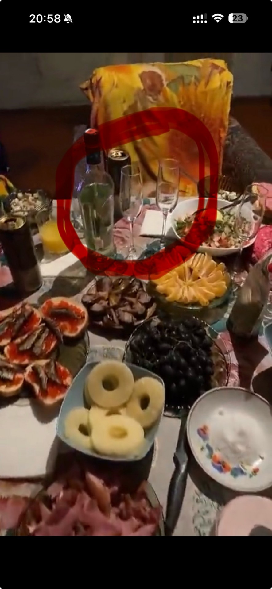Антураж в кельдыме интересный конечно, но жратва не плохая, рыбка нормальная, салаты, икорка тонким слоем со шпротиной, виноград, видимо дамы накрывали поляну, вон шампанское на столе и мандарины почищены и на дольки поделены, главное без мокрухи, а то в таких кельдымах она случается по синей дыне ...