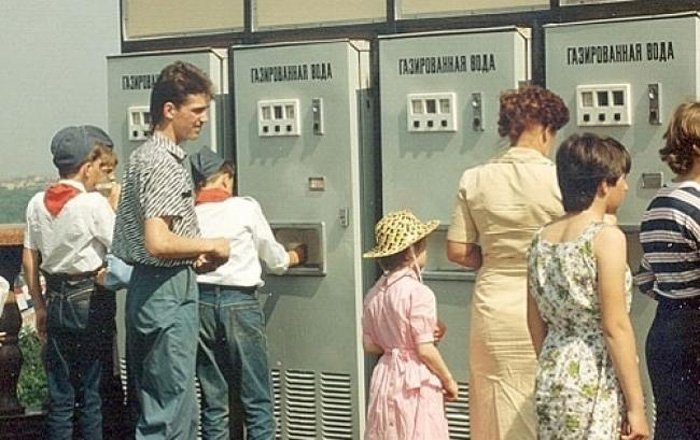 ой, я помню автоматы с газировкой и бочки с квасом и пивом. там стаканы и кружки никто особо не мыл, просто споласкивали, а хлеб был без пакетов и некоторые несознательные граждане бадлали ег прям руками чтоб проверить чёрствость. и ничё. выжили как-то ))