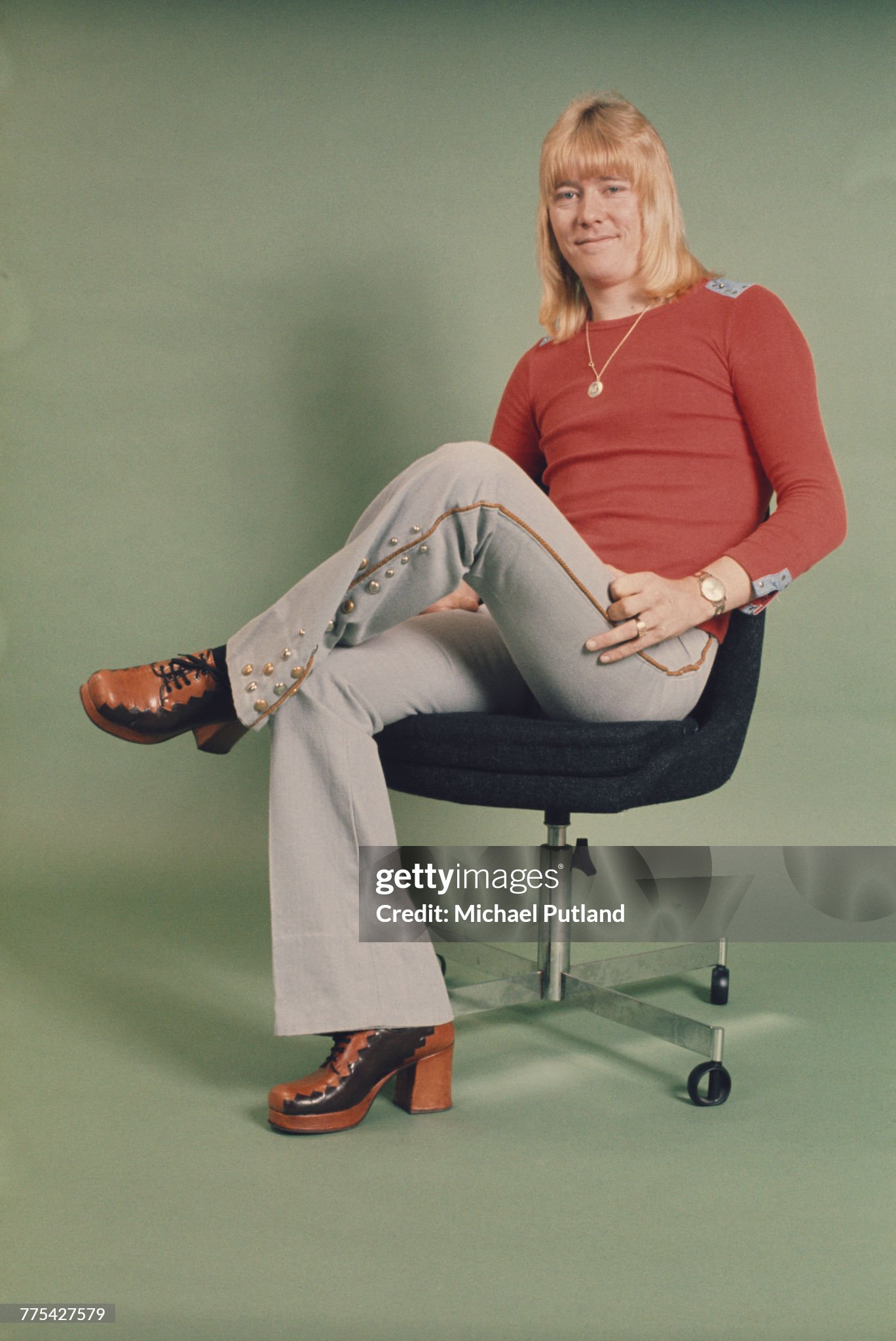 Singer Brian Connolly (1945-1997) of British glam rock group The Sweet posed wearing flared trousers and platform shoes seated on a swivel chair circa 1975. (Photo by Michael Putland/Getty Images)