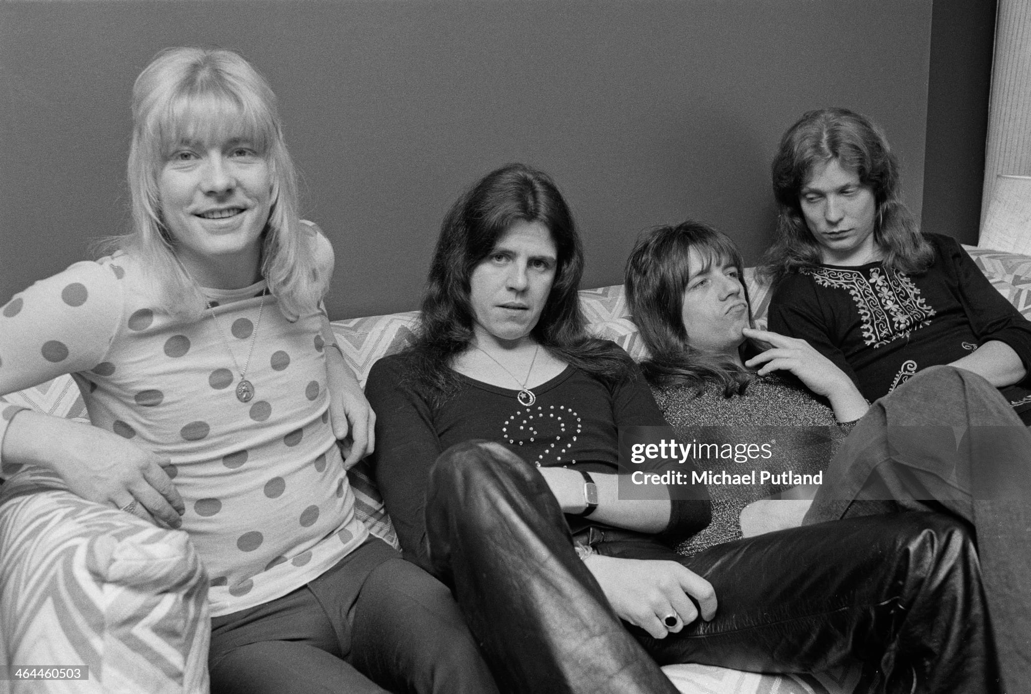 British glam rock group The Sweet, 16th January 1974. Left to right: Brian Connolly (1945 - 1997), Mick Tucker, Andy Scott and Steve Priest, (1947 - 2002). (Photo by Michael Putland/Getty Images)