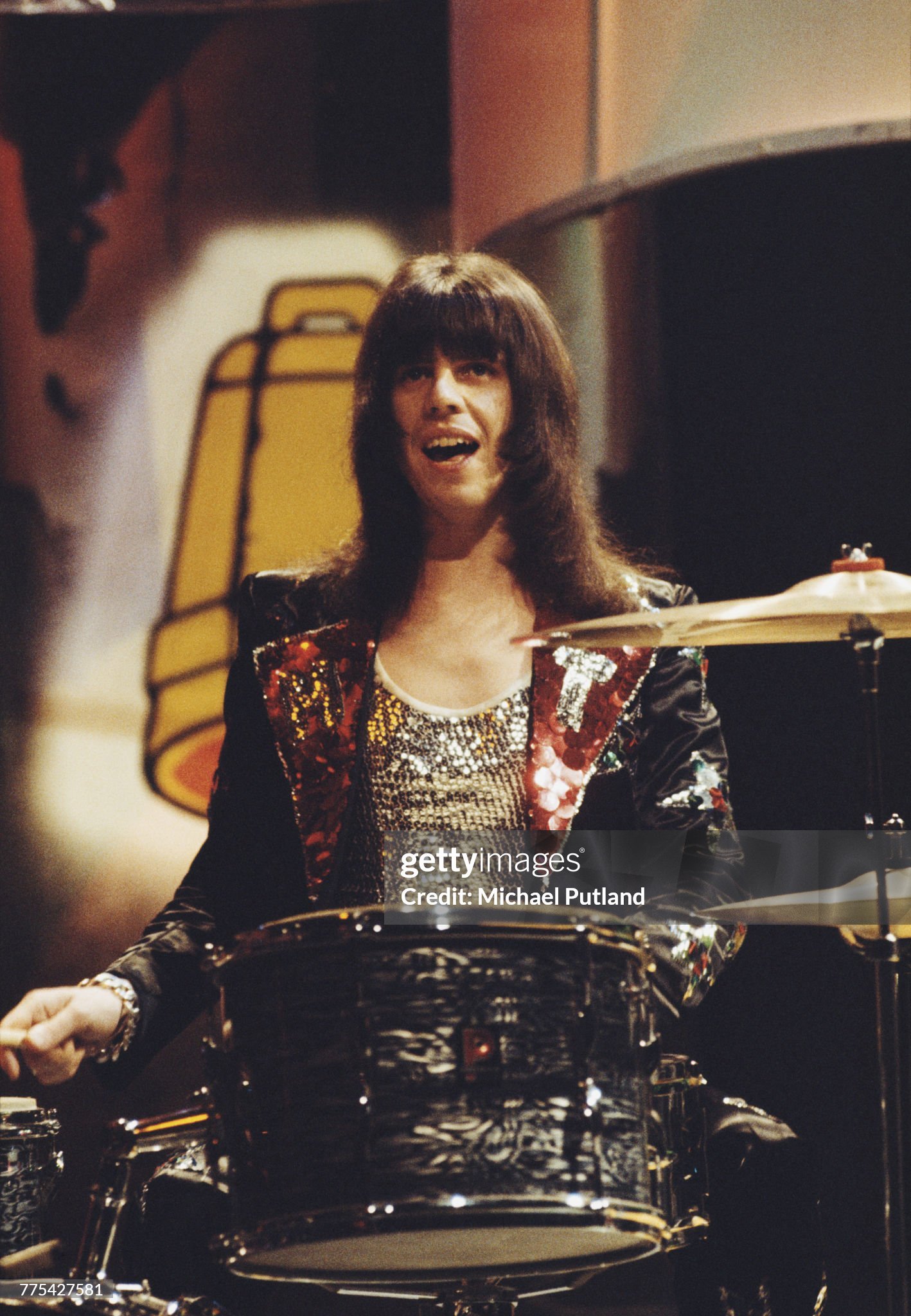 Барабанщик Мик Такер (1947–2002) выступает с британской глэм-рок-группой Sweet на музыкальном шоу BBC «Top Of The Pops» в Лондоне, около 1973 года. (Фото Майкла Путланда/Getty Images)