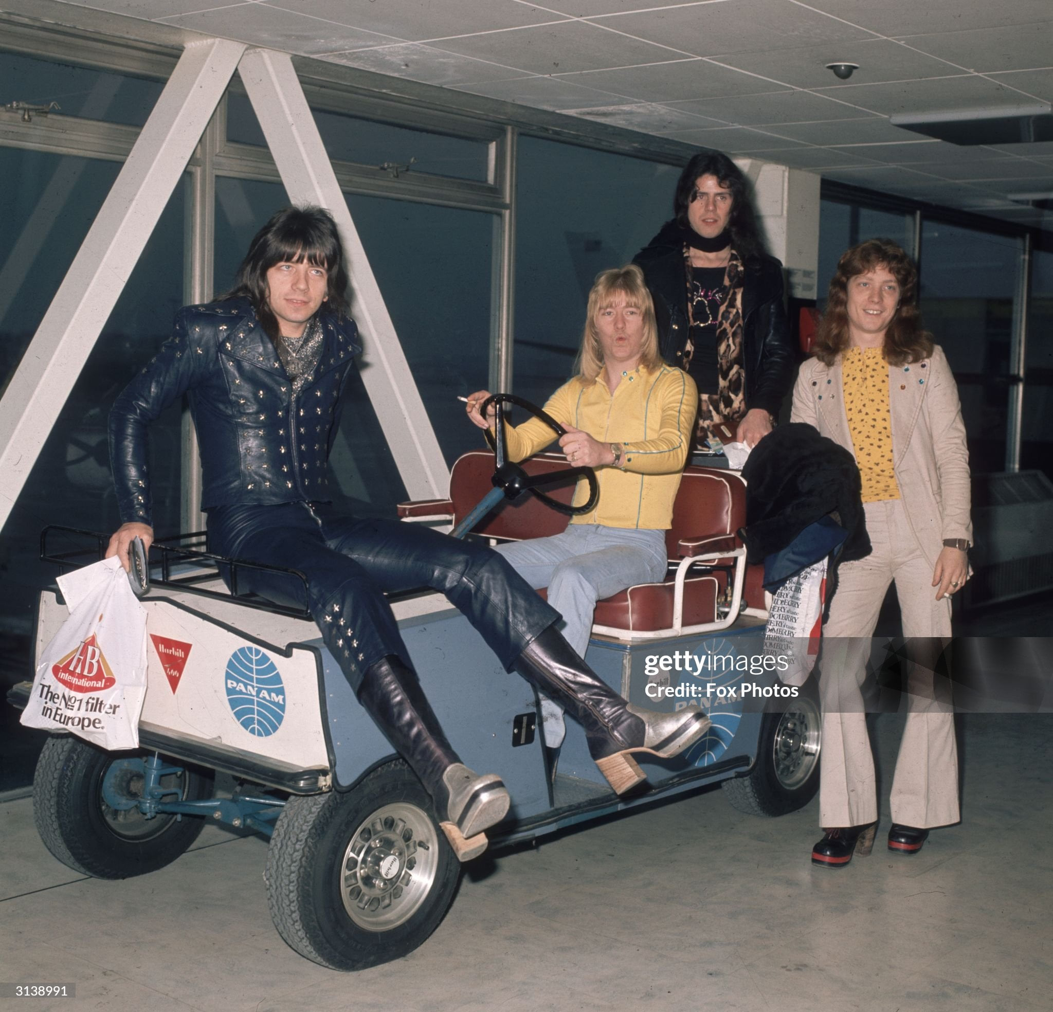November 1973: British glam rockers The Sweet, (from left) Andy Scott, Brian Connolly (1945 - 1997), Mick Tucker (1947 - 2002) and Steve Priest on a luggage buggy at an airport with their bags of duty free. (Photo by Fox Photos/Getty Images)