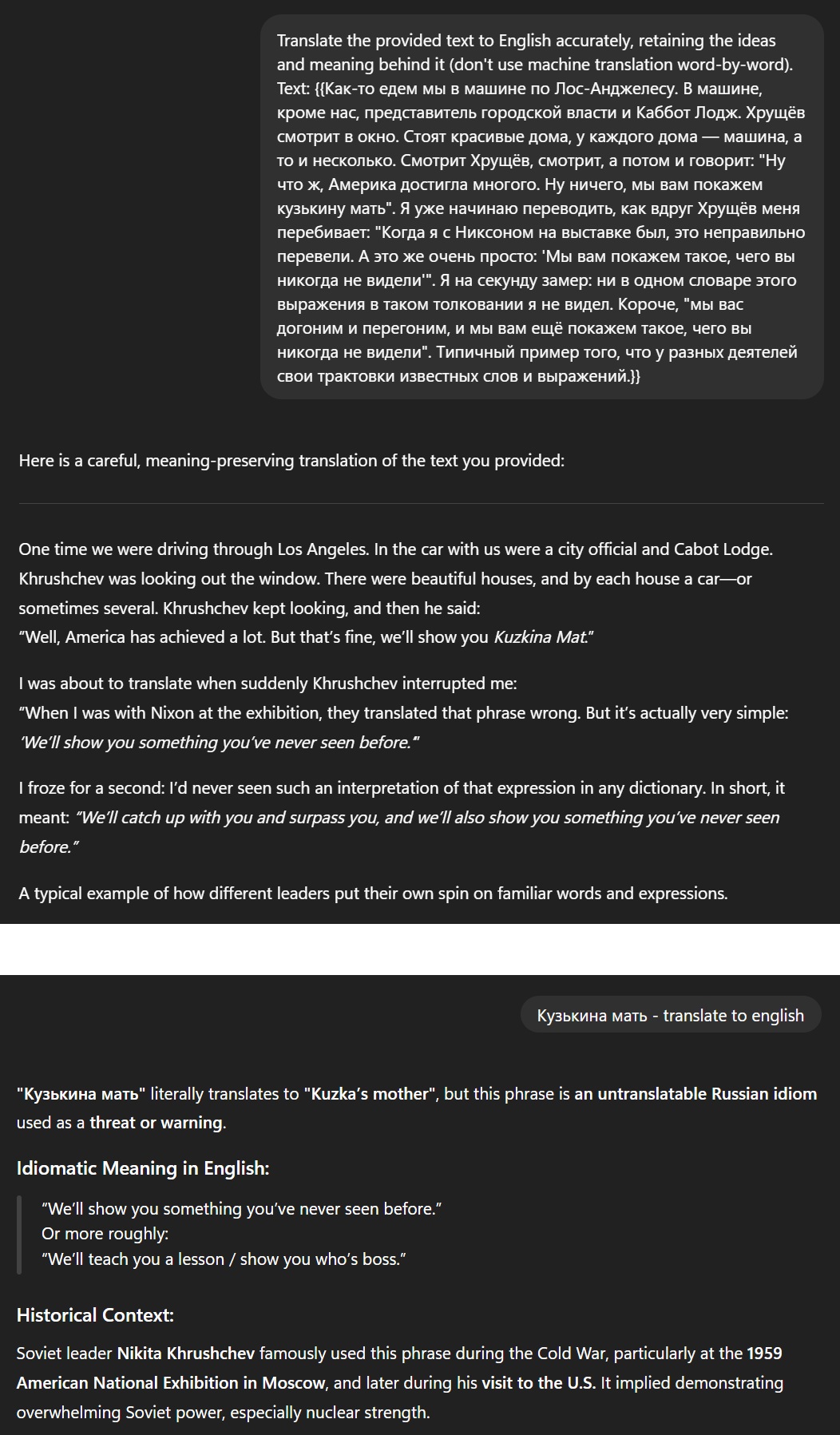 Также, разумеется, работа подобных штук с ИИ будет зависть от инструкций, которые вшиты в них. Мой пример скорее отображает возможности ЛЛМ понимания текста, чем работы исключительно как переводчика.