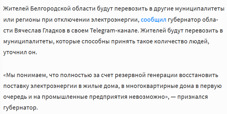 ...Губернатор Белгородской области заявил, что обычно власти стараются оповещать о действиях по ликвидации последствий ЧП, но при отключении света в регионе они решили этого не делать, «чтобы не дать такую нужную информацию врагу».