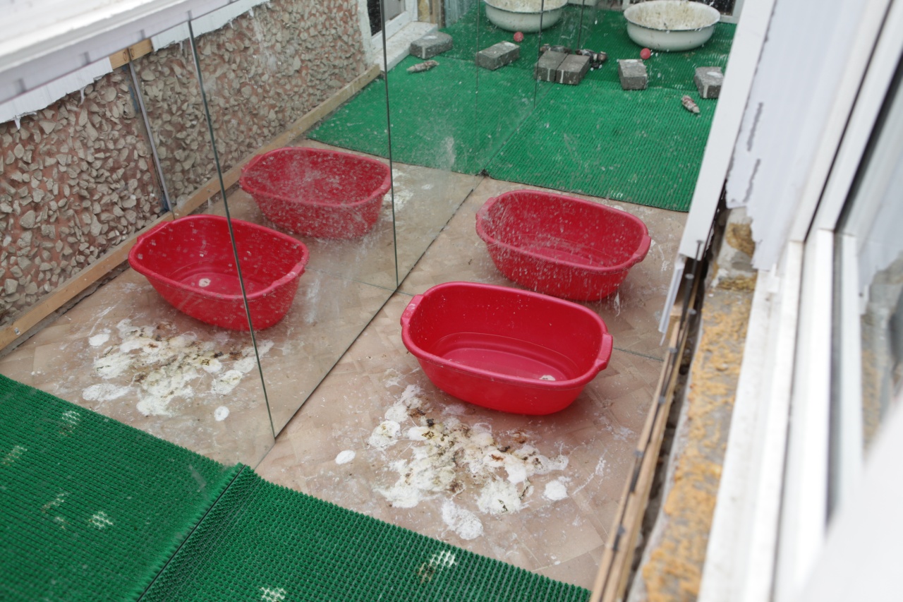 Я живу в многоквартирном доме и по этому жилищем для птицы стал остеклённый балкон. На балконе проведены спец работы по благоустройству обитания птицы. Пол устлан т.н. ворсистым покрытием, покрытие это пластиковое и легко отмывается, ну а главная от него польза в том, что я могу смело ходить по балкону не вляпываясь в помёт, т.к. он находится внизу ворса. Маленький кусочек балкона застлан линолеумом. В этой части балкона стоит таз с водой для питься и купания, вода меняется каждый день. Также в этом месте организован слив воды за пределы балкона. В противоположной части балкона находится серверная стойка на 18U которая служит снизу шкафом для сопутствующих вещей, а сверху это место отдыха птицы, там же организована присада сваренная из железного профиля, к которой нейлоновыми стяжками прикреплена толстая ветка дерева. Присада является основным местом для птицы, на которой ворон проводит большую часть времени. Под присадой установлен эмалированный таз, который собирает большую часть помёта. Так же напротив присады расположено единственное прозрачное окно, через него ворон наблюдает за окружающим миром. Внутренняя часть балкона по периметру оклеена зеркалами. Зеркало это суть стекло, оно прочно и клювом ворон его не разобьёт, его просто мыть + на зеркале легко видно грязь. Всё скомпоновано для моих минимальных трудозатрат по обслуживанию балкона и для максимального комфорта для птицы.