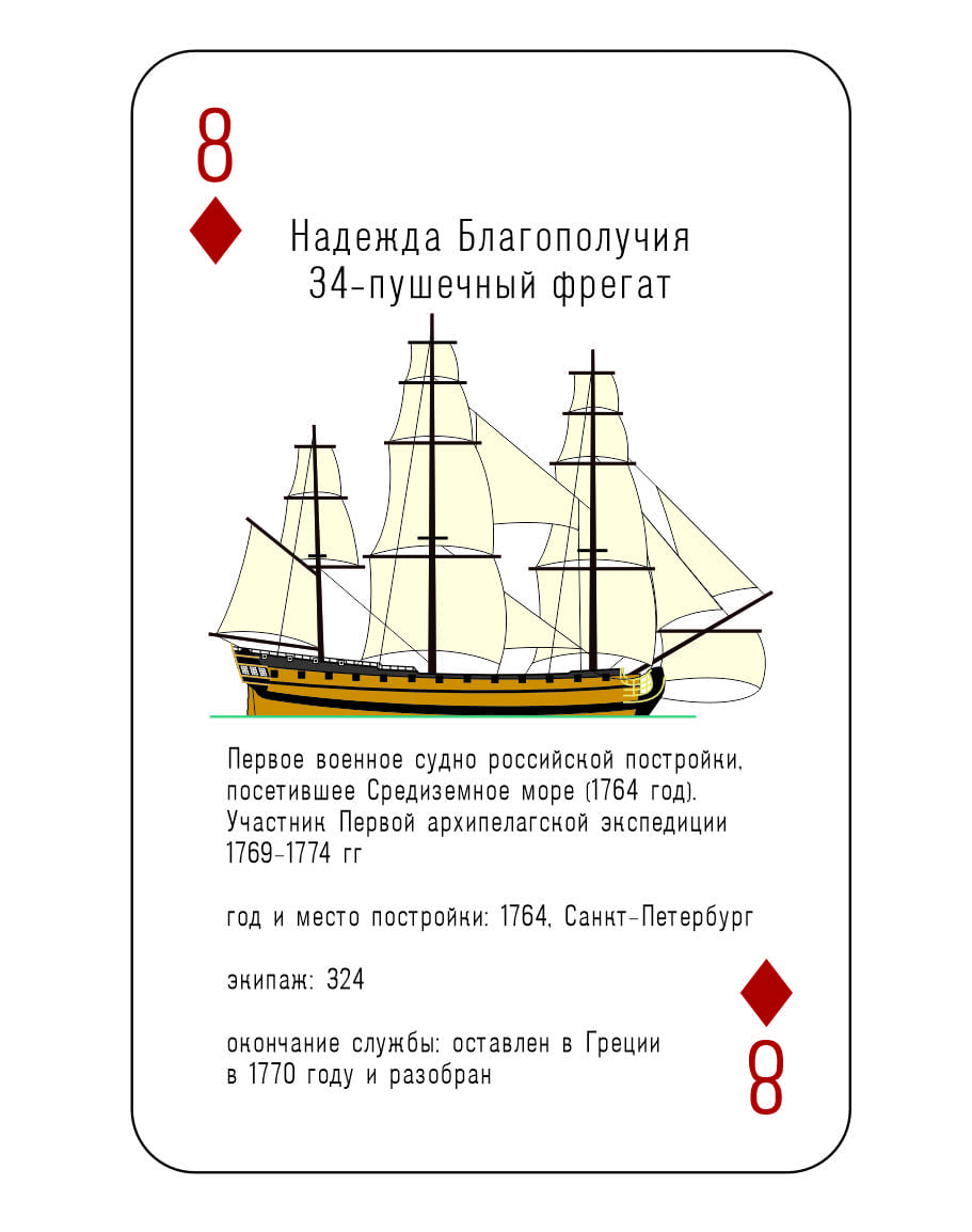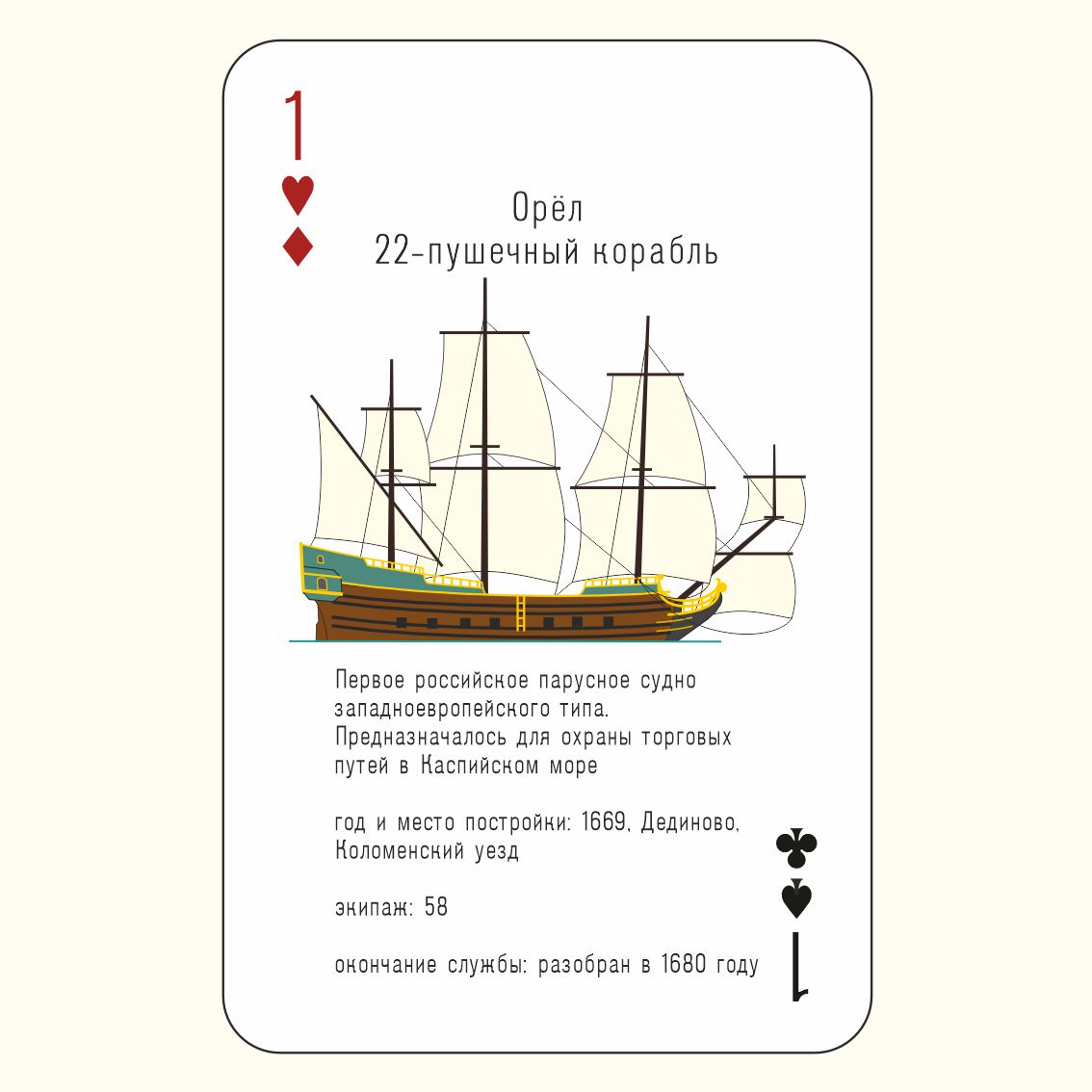 Будет ли в колоде "Военные парусники России" Орёл, построенный в 1669 году? Будет. Однако ради него пришлось выдумать новый номинал, т.к. Орёл по своей сути не вписывается ни в одну из четвёрок, ни в джокеры. Поскольку он первый, будет единицей)