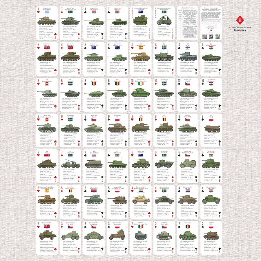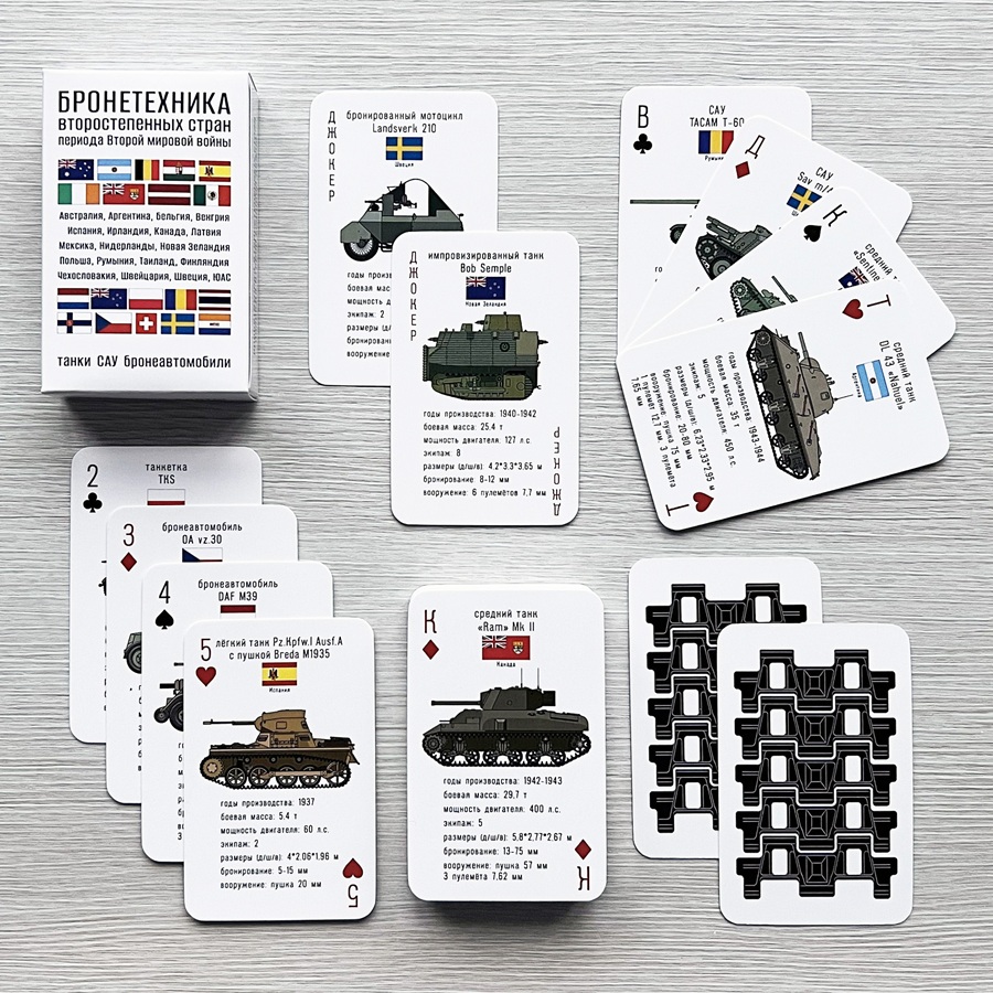 Колода содержит 54 игральные карты. На каждой карте размещено изображение танка, САУ или бронеавтомобиля Австралии, Аргентины, Бельгии, Венгрии, Испании, Ирландии, Канады, Латвии, Мексики, Нидерландов, Новой Зеландии, Польши, Румынии, Таиланда, Финляндии, Чехословакии, Швейцарии, Швеции или Южно-Африканского Союза