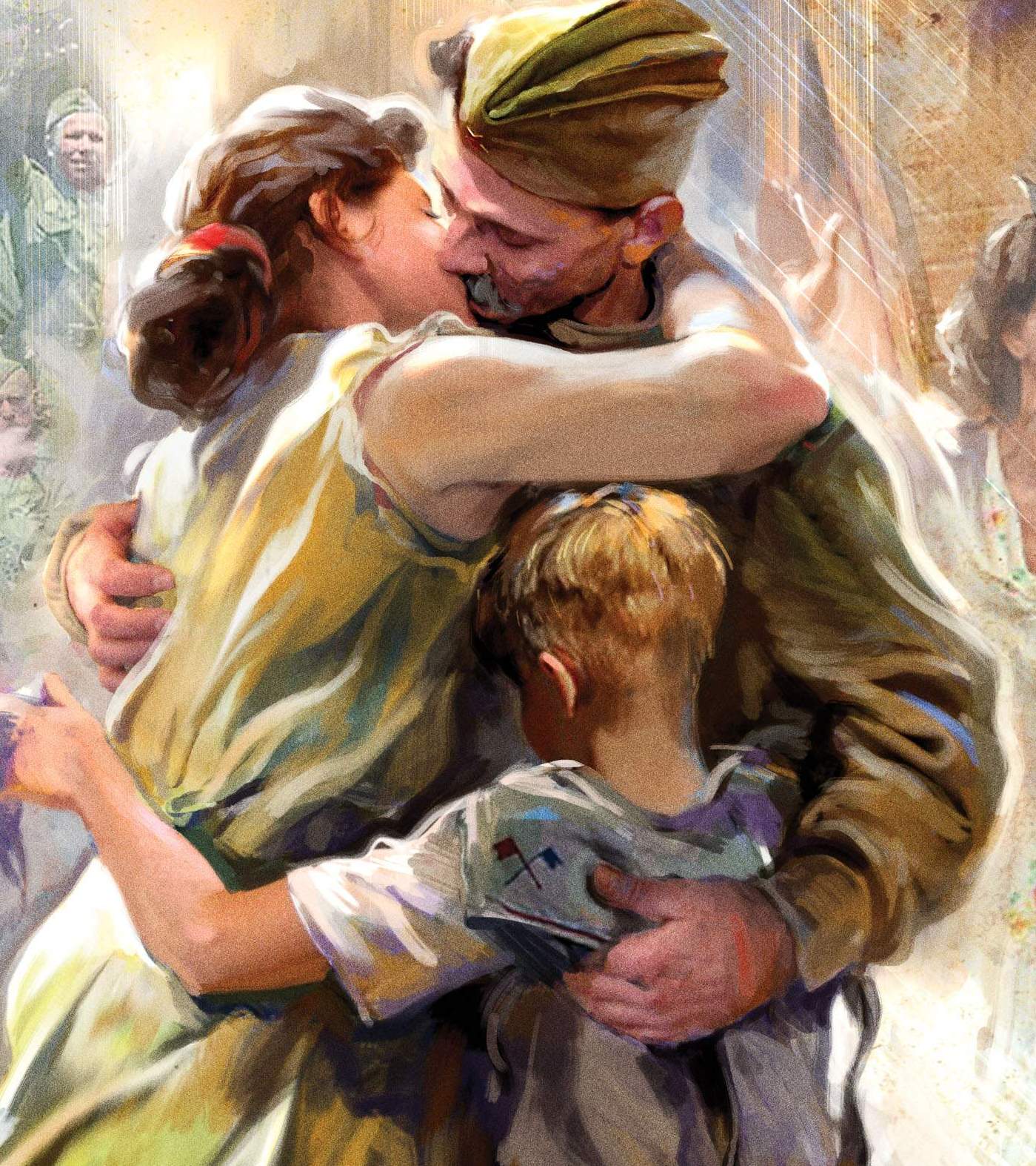 Вопрос: Почему солдат вернувшийся с войны и обнимающих родню, продолжает сжимать в руке какой то почтовый конверт?