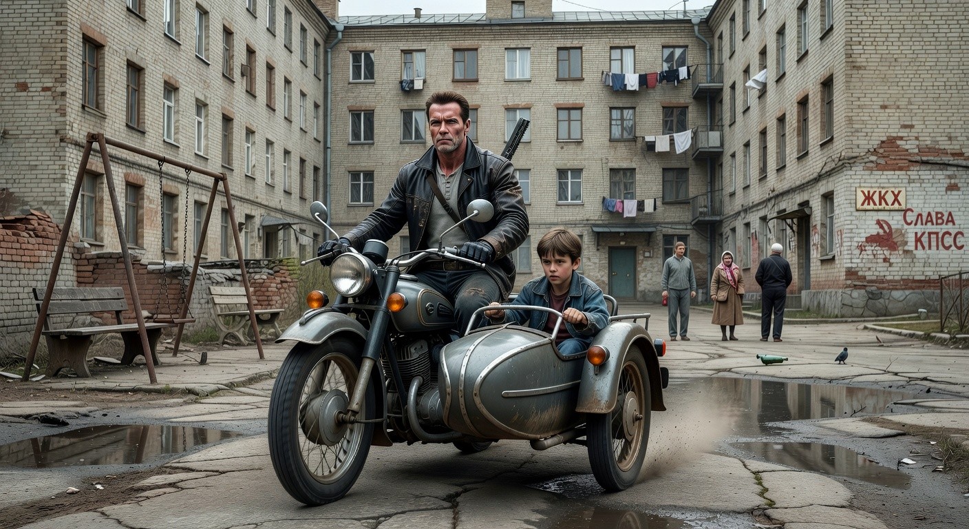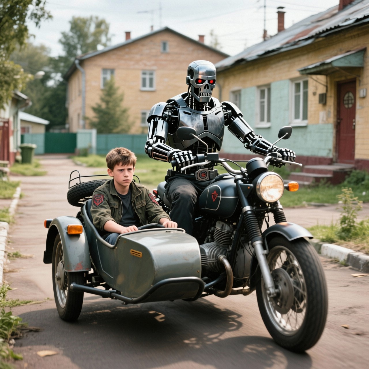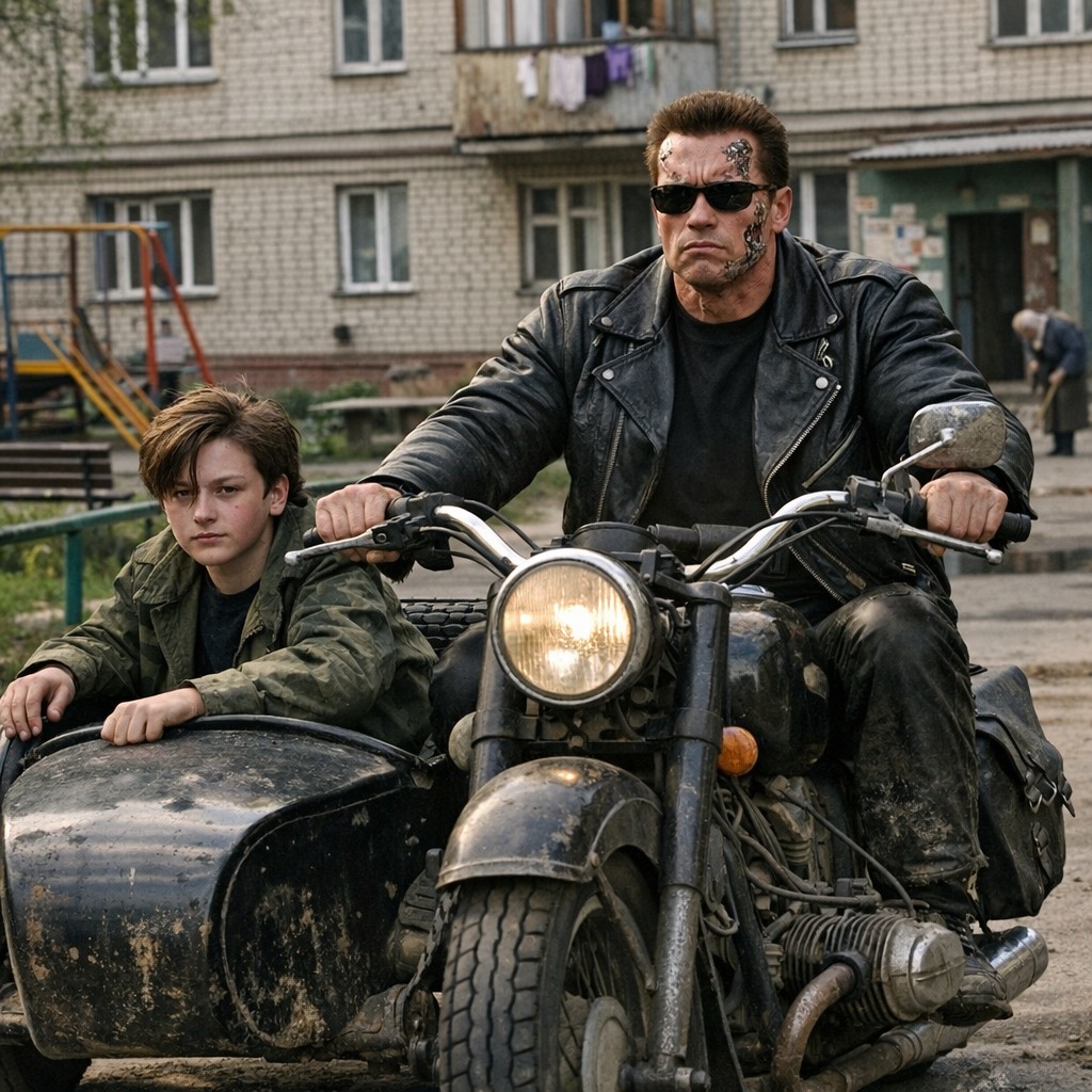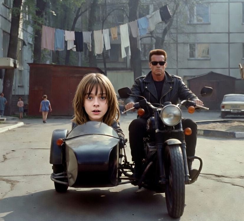 Форумчане,на просторах форума примерно месяца 3-6 назад видел картинку,как Терминатор Т-800 вместе с Джоном Коннором едут на мотоцикле с люлькой по обычному двору СССР. Эта картинка ИИ,очень мне запала,но найти ее никак не могу. Может есть кто тоже ее видел,буду очень признателен