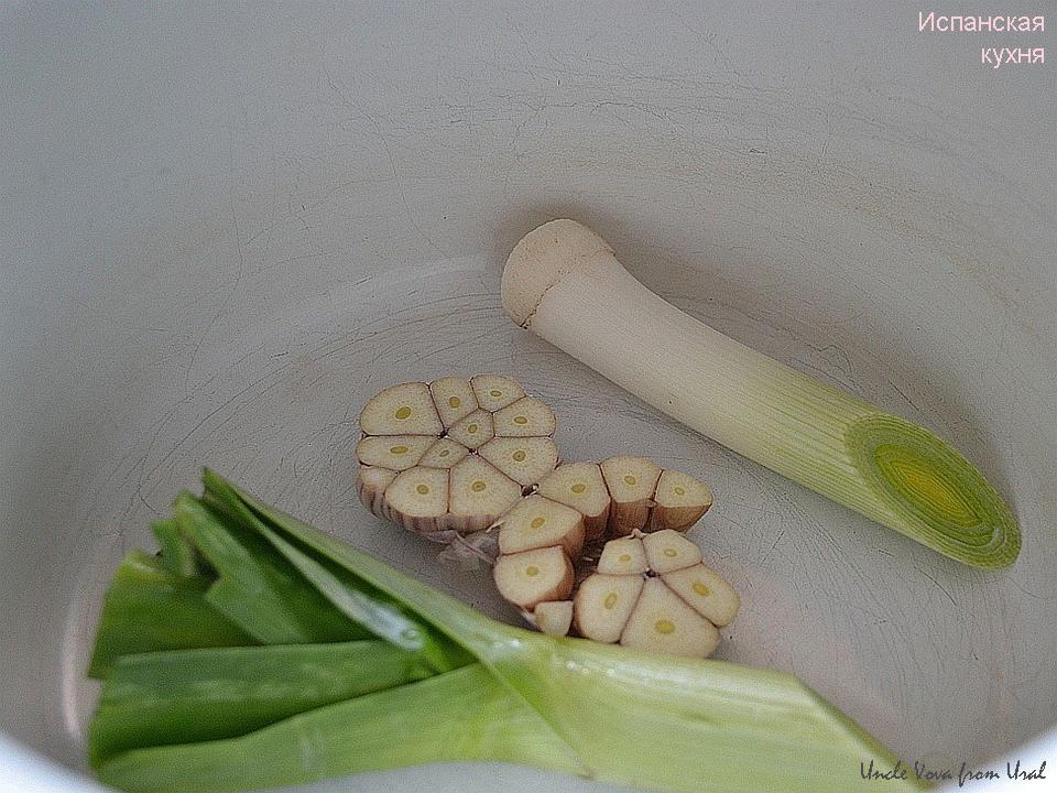 небольшая головка чеснока. Пополам её. Пара маленьких луковиц. Я взял двадцать см. порея.