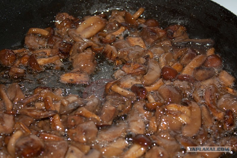К этому времени из грибов выпарилась вся лишняя вода, это видно по отсутствию пены в сковороде и явно видно что грибы жарятся в масле.