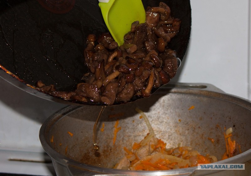 Параллельно в разогретую с маслом сковороду кидаем грибы.