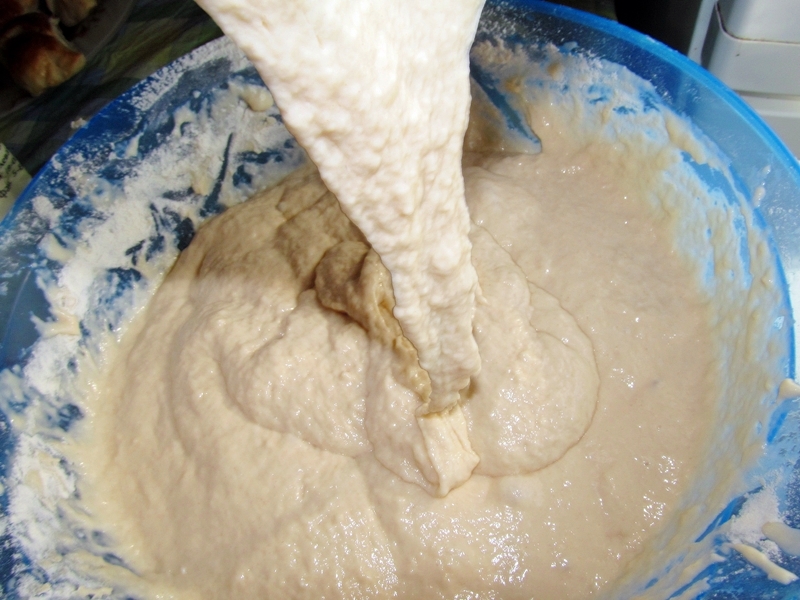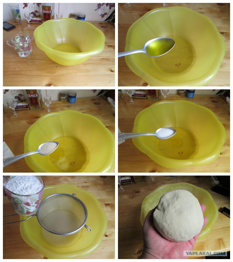 Все начинаем, естественно, с теста. Готовим опарным способом. Сперва дрожжи разводим в теплой воде, добавляем столовую ложку сахара, ложку муки. Оставляем на 20-30 минут, чтобы образовалась шапочка. Смешиваем остаток тёплой воды с дрожжевой смесью. Добавляем просеянную муку, соль, яйцо (можно желток), масло. Перемешиваем, оставляем в теплом месте часа на два, обминаем, оставляем еще на час. (к слову, возня здесь только с тестом, которое потом прекрасно хранится в холодильнике несколько дней). По консистенции оно получается, как на оладьи, густое, но липкое, лепить из него не получится.
