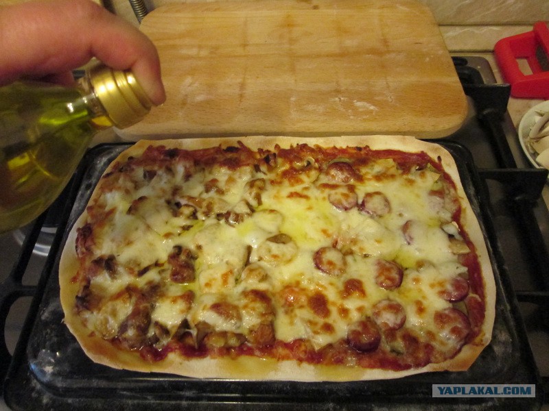 Свежее испеченную пиццу сбрызгиваем сверху оливковым маслом, совсем не много, заливать не надо smile.gif