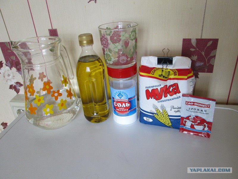 Начнем с теста. Нам понадобится вот такой элементарный набор – Вода, Мука, Соль, Дрожжи, Оливковое масло.