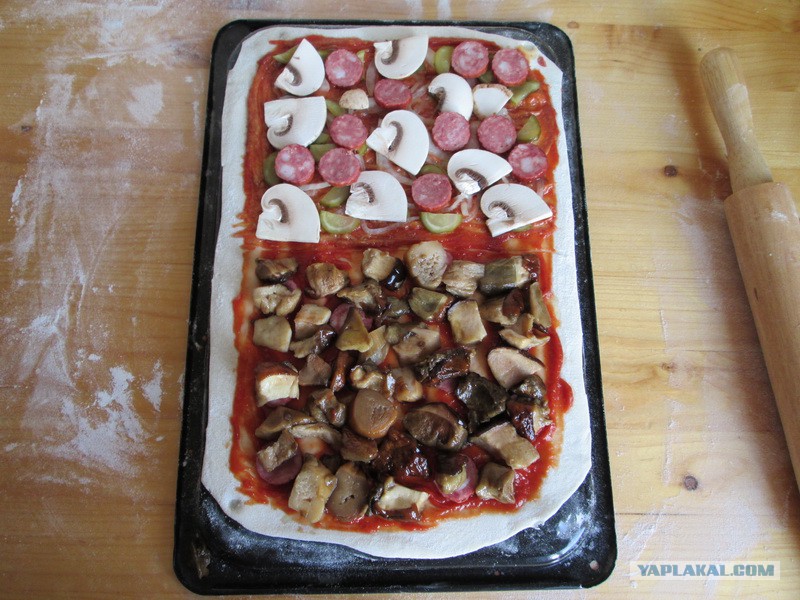 А вот тут у меня готовится Аляска и Деревенская с белыми грибами. К стати, я обычно делаю на одном «листе» сразу две разных. Так удобней гостей угощать.