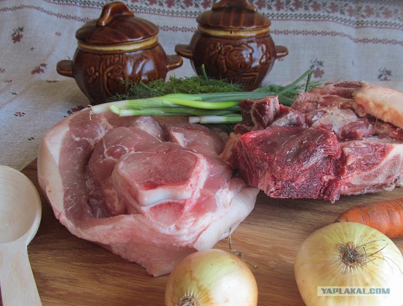 Мы будем готовить борщ в горшочках с классическим набором продуктов. Для бульона возьмем говяжьи кости и свиную мякоть, луковицу, морковь и большую кастрюлю. Варить бульон в маленькой таре – кощунство.