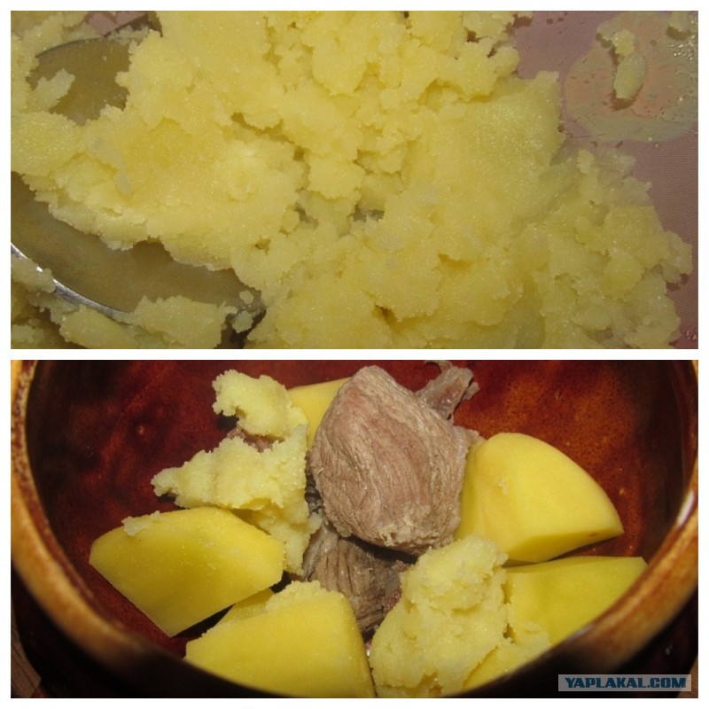 Достаем горшочки, мясо, сырой картофель. Отваренную нужно растолочь и понемногу добавить в каждый горшок. Зачем? Как ни странно, но для вкуса, как и морковь на терке, это даст густоту, насыщенность блюду. А красота бульона в борще роли не играет.