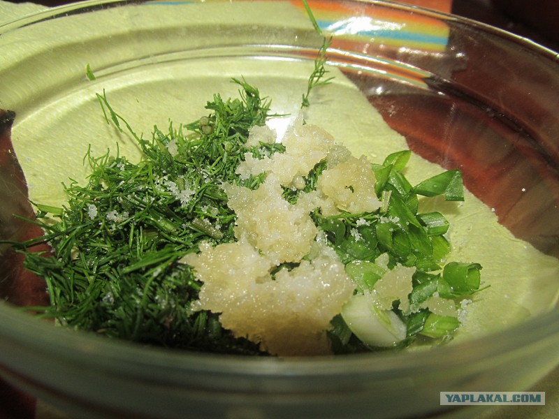 Следующий этап – заправка. Сало нам тут ни к чему, т.к. насыщенный бульон и зажарка уже сделали свое дело. Любую зелень по вкусу+чеснок+соль растираем в тарелке и по ложке добавляем в горячие горшки и даем настояться. На следующий день все вкусы и ароматы будут ярче, но кто ж будет ждать.