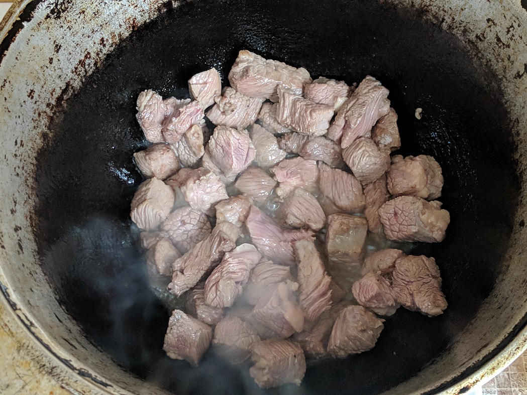 Мясо нарезала на куски, обжарила до золотистости. Добавила прижаренные на сухой сковороде лук и морковь. Посолила. Посыпала приправами по своему вкусу (перец, барбарис, зира) залила приличным количеством воды и варила около часа.