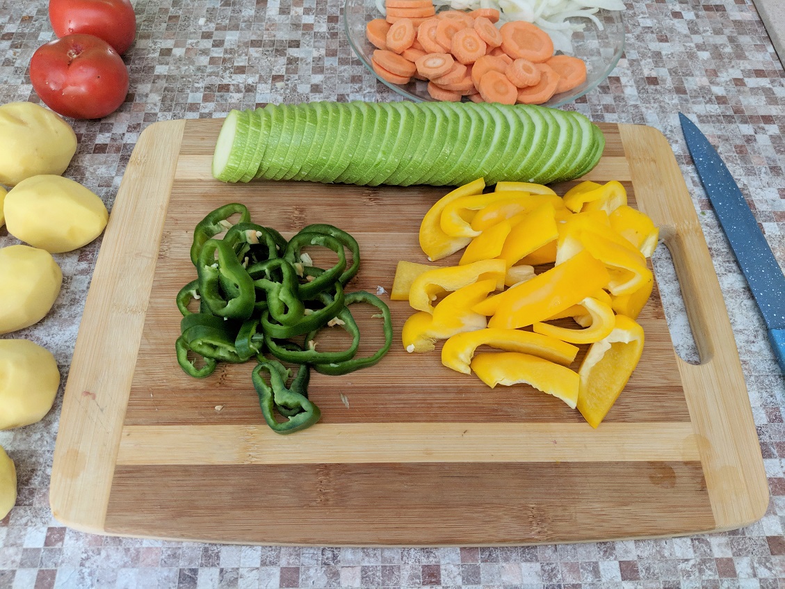 И ещё в маклюбе должно быть много разных овощей. Это может быть картошка, цветная капуста, кабачки. Я выбрала помидоры, баклажан, красный перец.