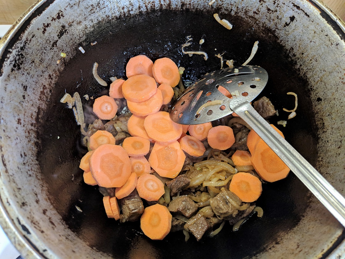 3. Выкинув ставшие ненужными лук и чеснок, закладываем мясо.