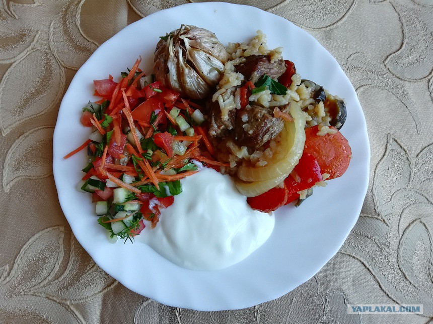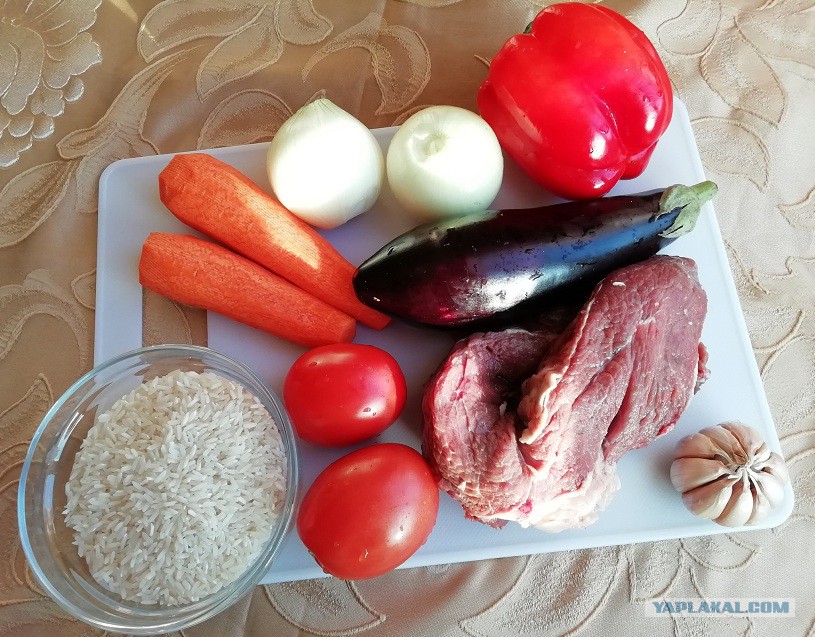 А раз это плов, то кроме мяса ещё должен быть рис, лук, морковь, чеснок.