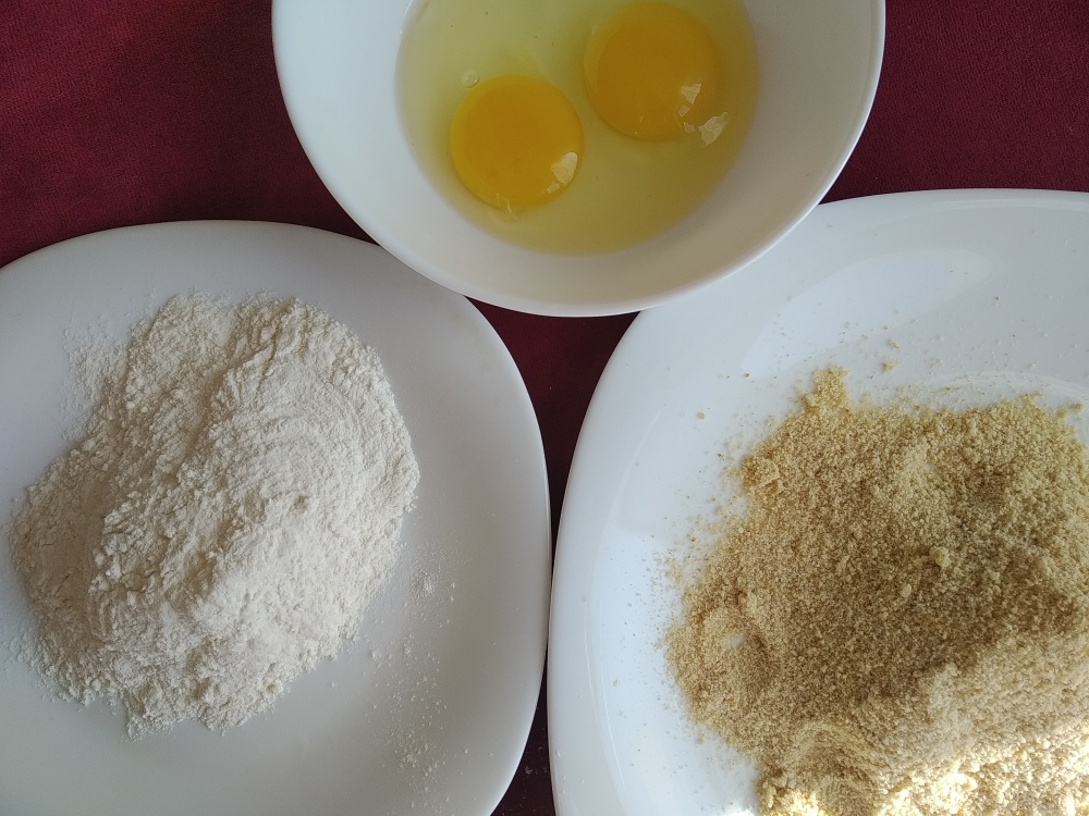 Подготавливаем все для панировки. Сначала в муку, потом аккуратно в яйцо (которые предварительно взбить), последний этап - сухари.