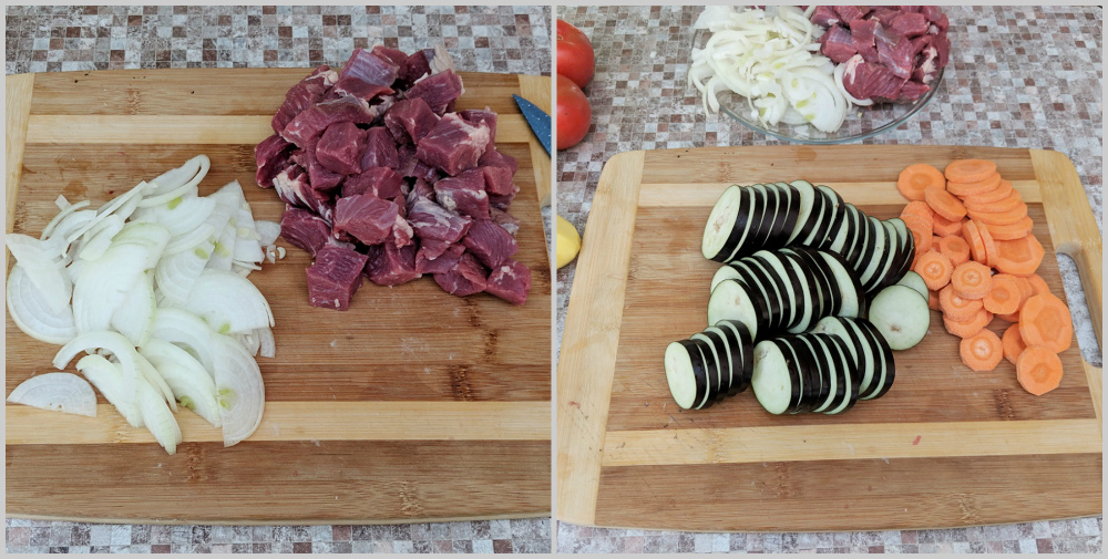 3. Пока мясо варилось, подготовила овощи. Порезала баклажан, морковь и лук кружочками, а перец квадратами. Обжарила с двух сторон на сковороде смазанной маслом. Все по отдельности.