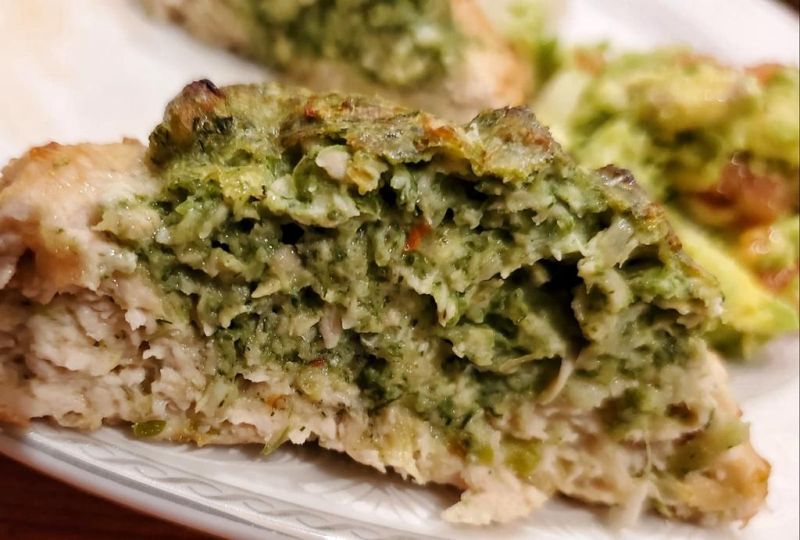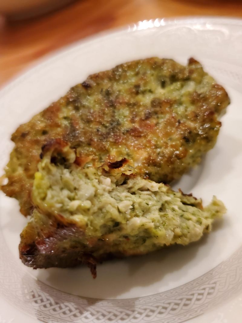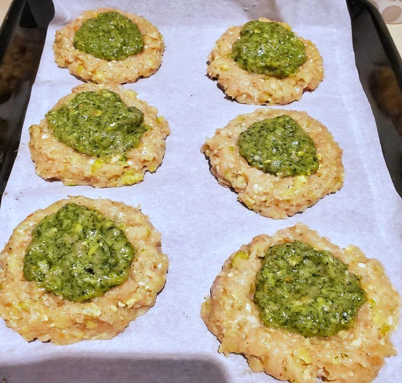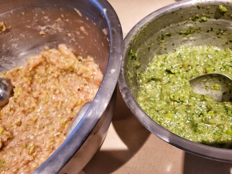 Если честно, то мне было лень заморачиваться с разным фаршем. У меня была только куриная грудь. Эту часть курицы хоть жарь,хоть вари, у меня в семье никто не любит. Я обычно делаю мясные запеканки, в которые добавляю много овощей. Иначе овощи в малышатину не впихнешь. Перебирают кусочки, на тарелке размазню делают и так далее. Немного поднадоело...)))))))) Этот вариант двух-этажных котлет - отличная вещь для детей! Я сделала куриный фарш( около 900гр курятины), туда добавила 2 зукини(пюре), репчатый лук,немного соли, 1 ст ложку картофельного крахмала, 1 яйцо. Потом разделила фарш на 2 части. В одну добавила зелень и брокколи(пюре)
