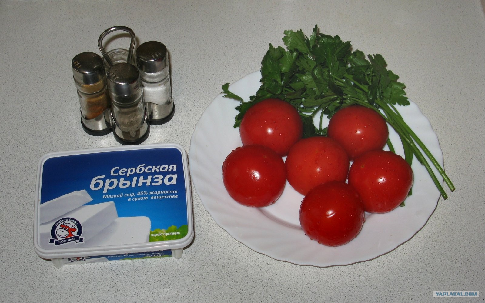 К брынзе добавил мелко нарубленную петрушку и раздавленный чеснок. Размял это дело вилкой. Из помидоров при помощи ложки извлёк внутренности.