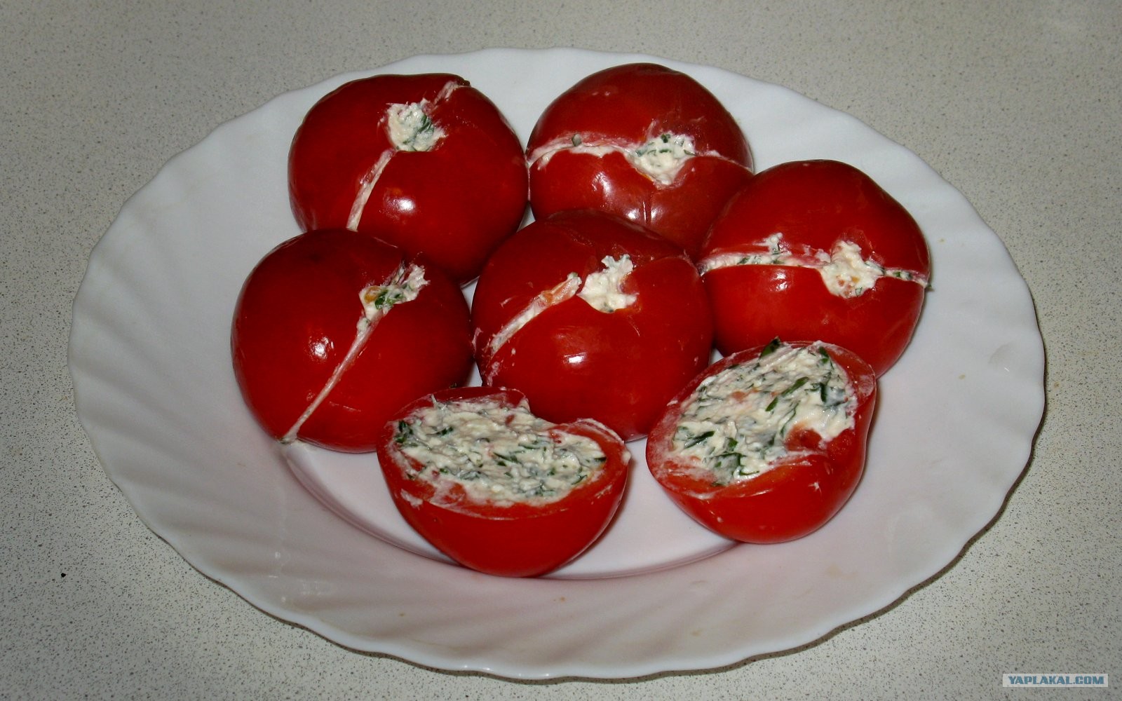 Половинки помидоров наполнил начинкой и слепил их вместе.