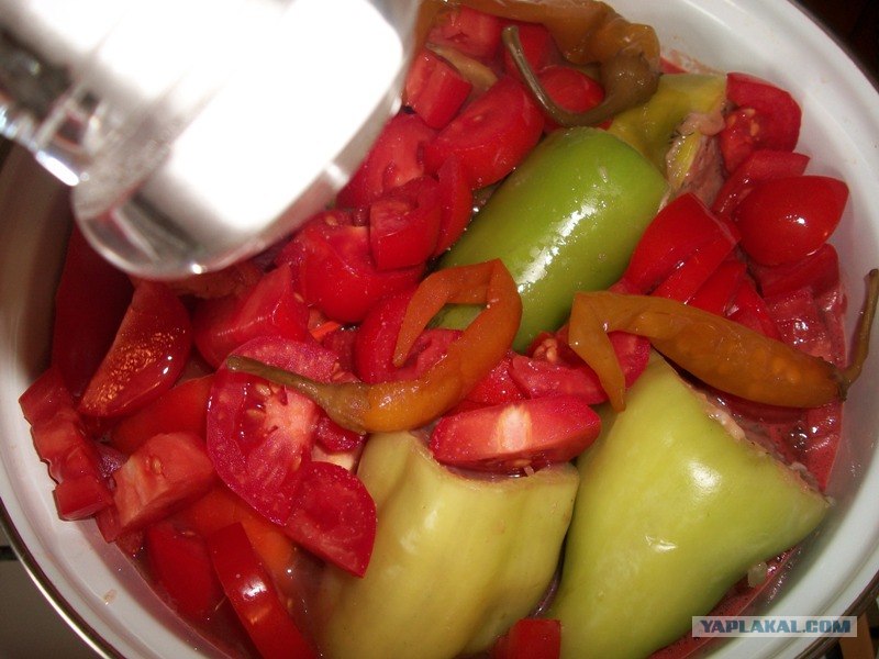 14. В кастрюлю перцем высыпаем помидоры, добавляем острый перец, горячий томатный сок и при необходимости немного кипятка. Солим еще немного и перчим.