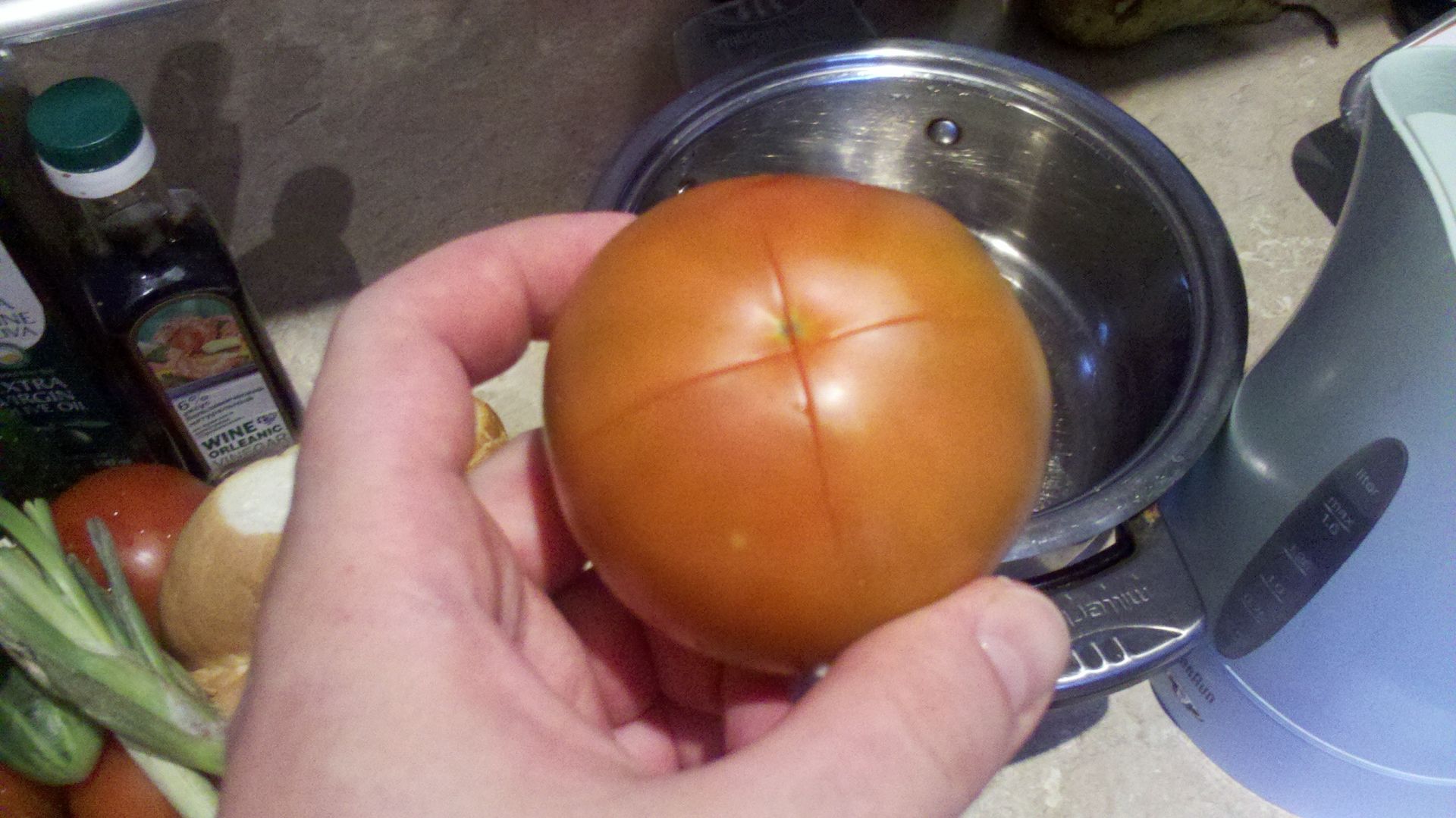 на голове (или ногах?) томатов делаем крестообразные надрезы, как инквизиторы на еретиках примерно.