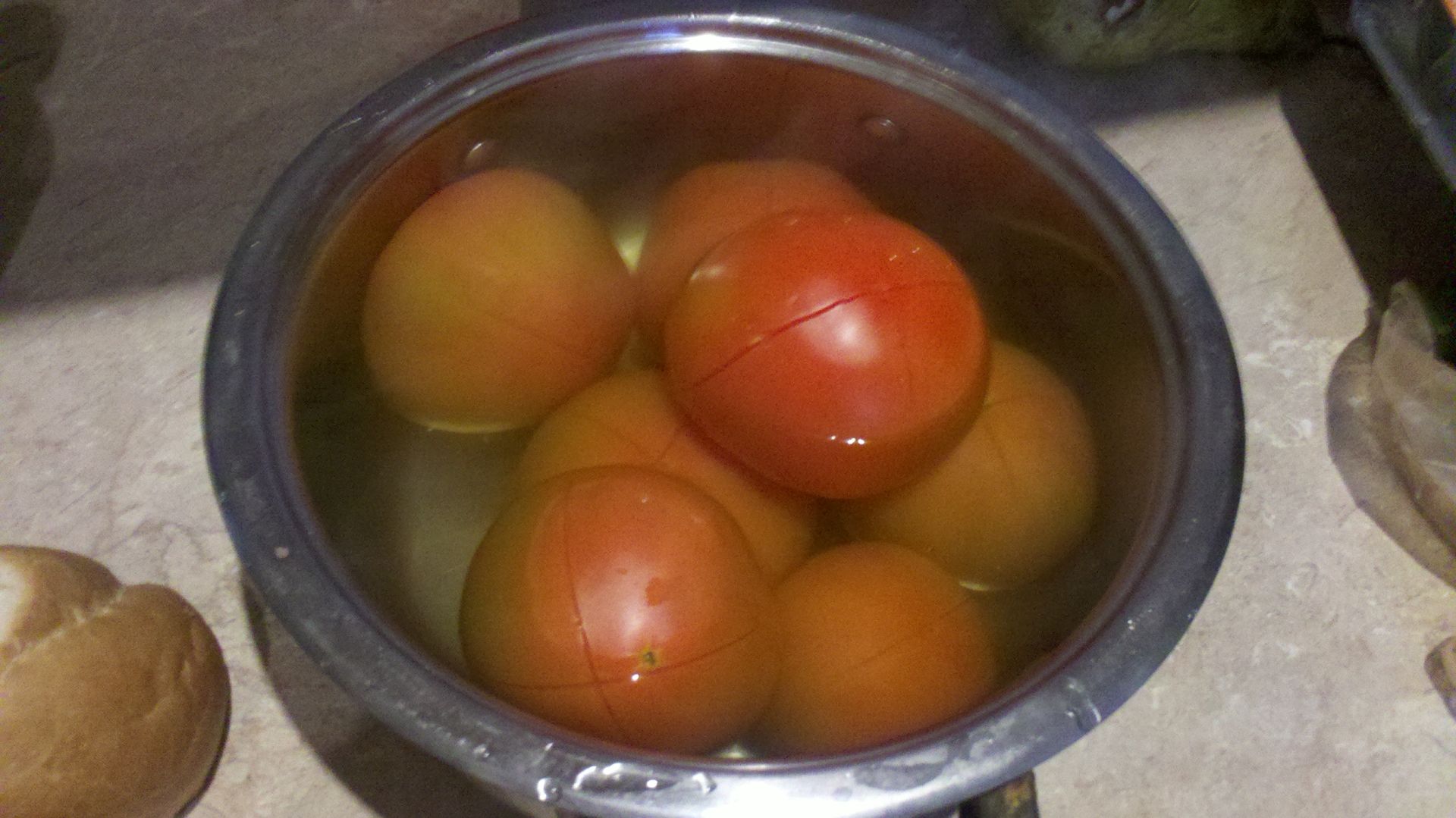 надрезанные томаты складываем в братскую кастрюлю и заливаем кипятком на минуту.