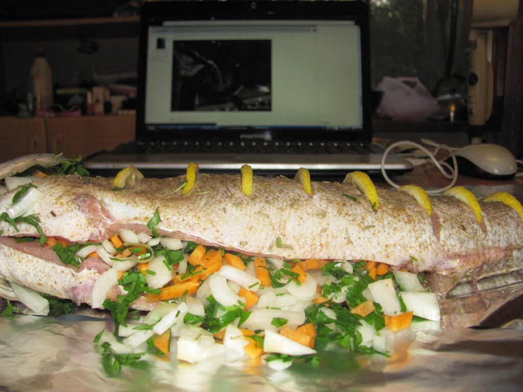и, сталобыть, судачка натер тщательней, снаружи и изнутри, потом нафаршировал - и в тушку, и в бошку, и лимончик аккуратненько...