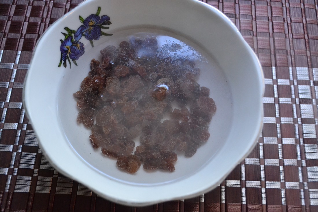 Горсть изюма заливаем тепленькой водичкой и ставим отмокать.