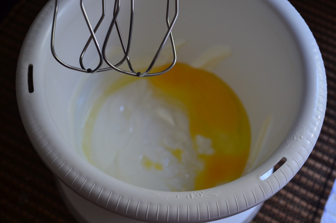 Стакан сметаны (это примерно 250 грамм) выкладываем в чашу миксера. Разбиваем туда же одно яйцо и смешиваем.