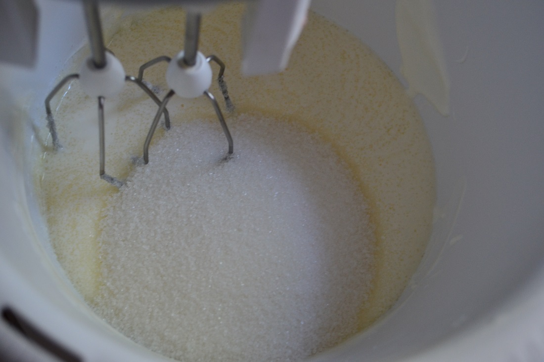 4. Добавляем стакан сахара и продолжаем взбивать.