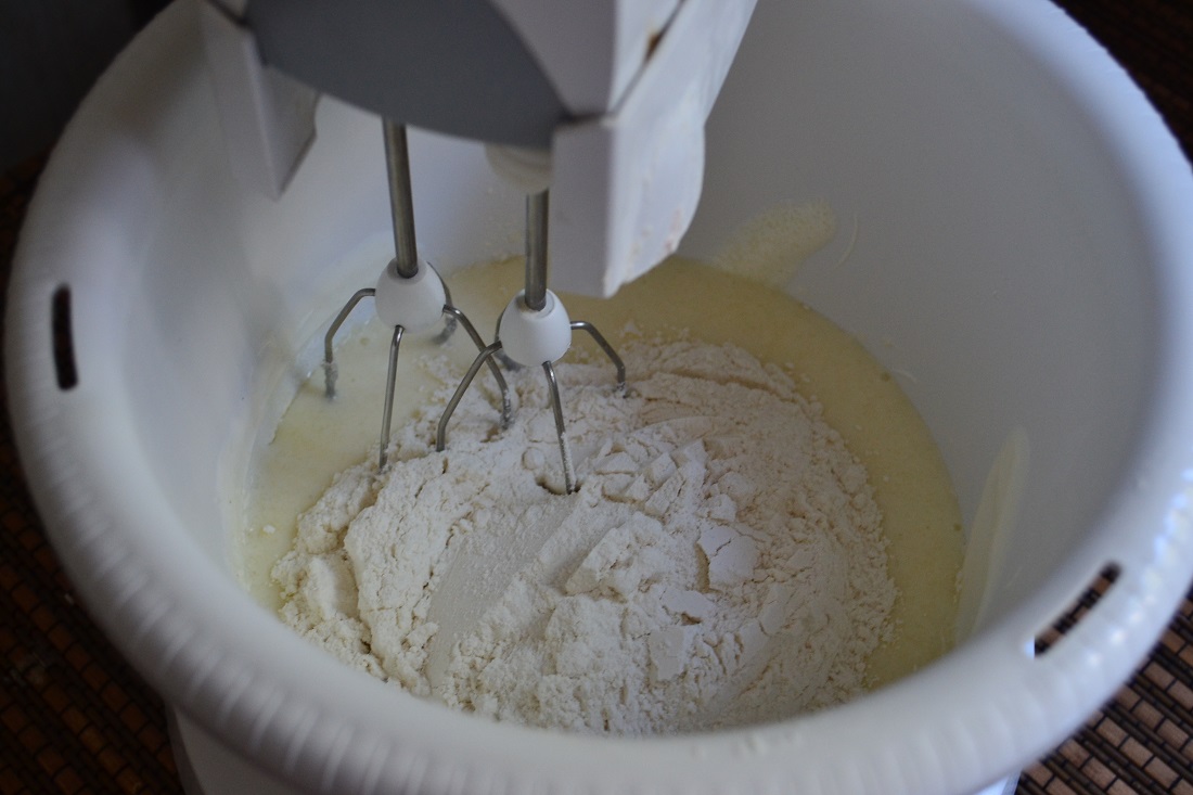 5. Добавляем в чашу стакан муки и опять взбиваем.