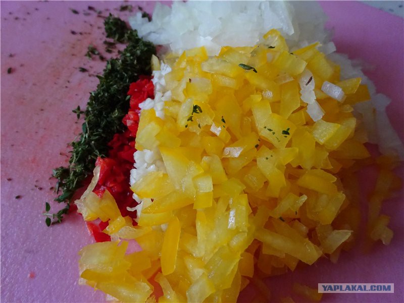 Превратила филе индейки в фарш, мелко нарезала половинку болгарского перца, лук (у Рэйчел рекомендован шалот или красный, я решила взять обычный), чеснок, острый красный перчик и свежий тимьян.