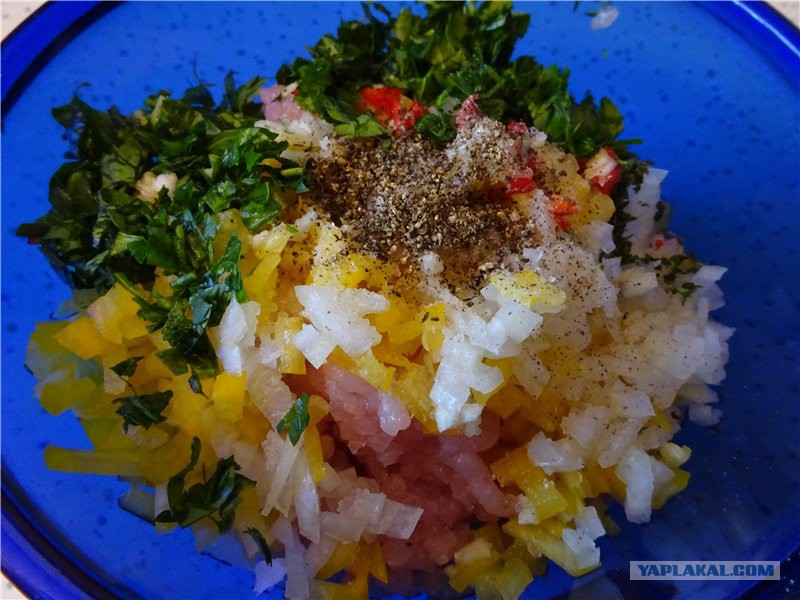 Все смешала с фаршем, посолила-поперчила, про петрушку вспомнила в последний момент. Добавила столовую ложку маскарпоне и хорошенько перемешала.