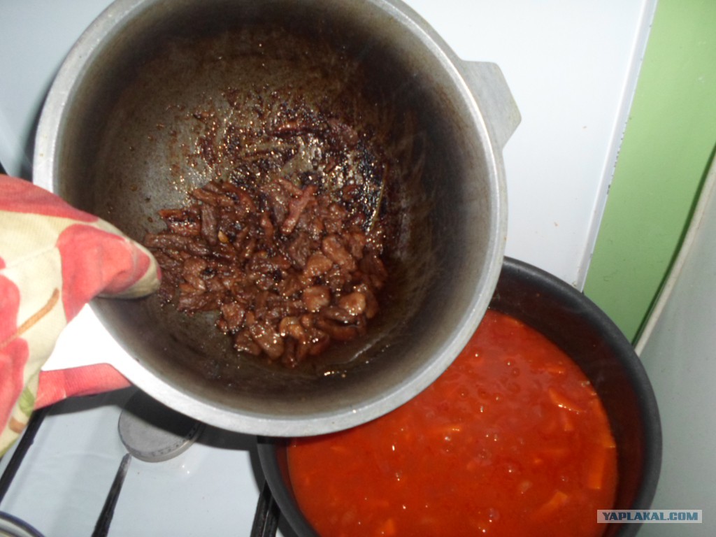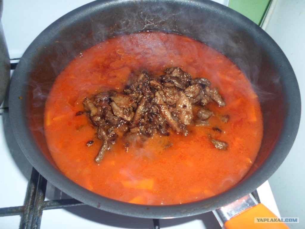 На треть объем жидкость (в овощах) уменьшился и мы приступаем к синтезу на молекулярном уровне, т.е. закидываем в тушёные овощи наше тушеное мясо.