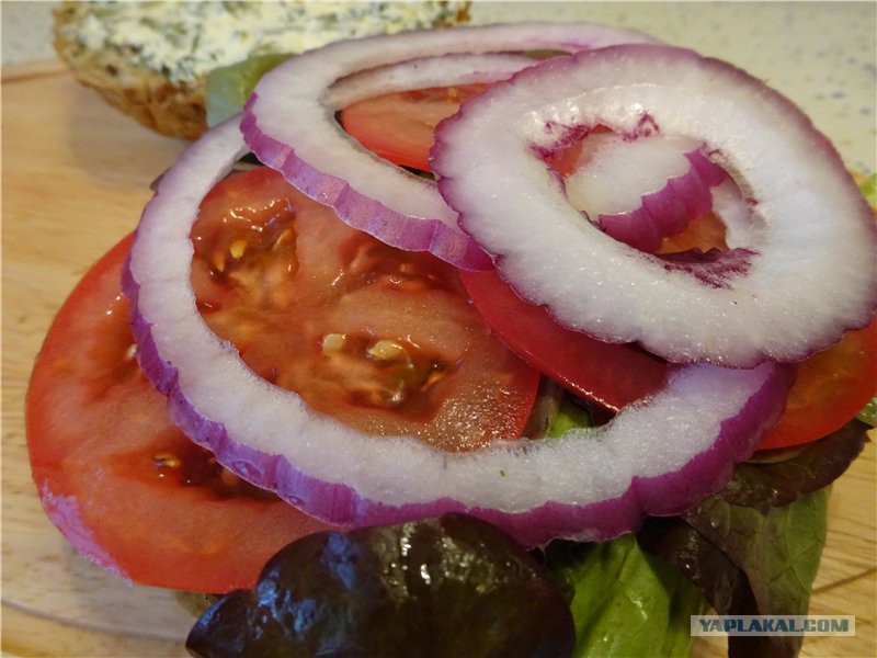 Релиш на нижнюю булочку, на верхнюю я подумала и намазала смесью маскарпоне, зелени, горчицы и маринованных огурчиков. Это мне стало скучно ждать, пока дойдет котлетка и нагреется булка. Красные салатные листья, сверху помидор колечками и кольца лука.