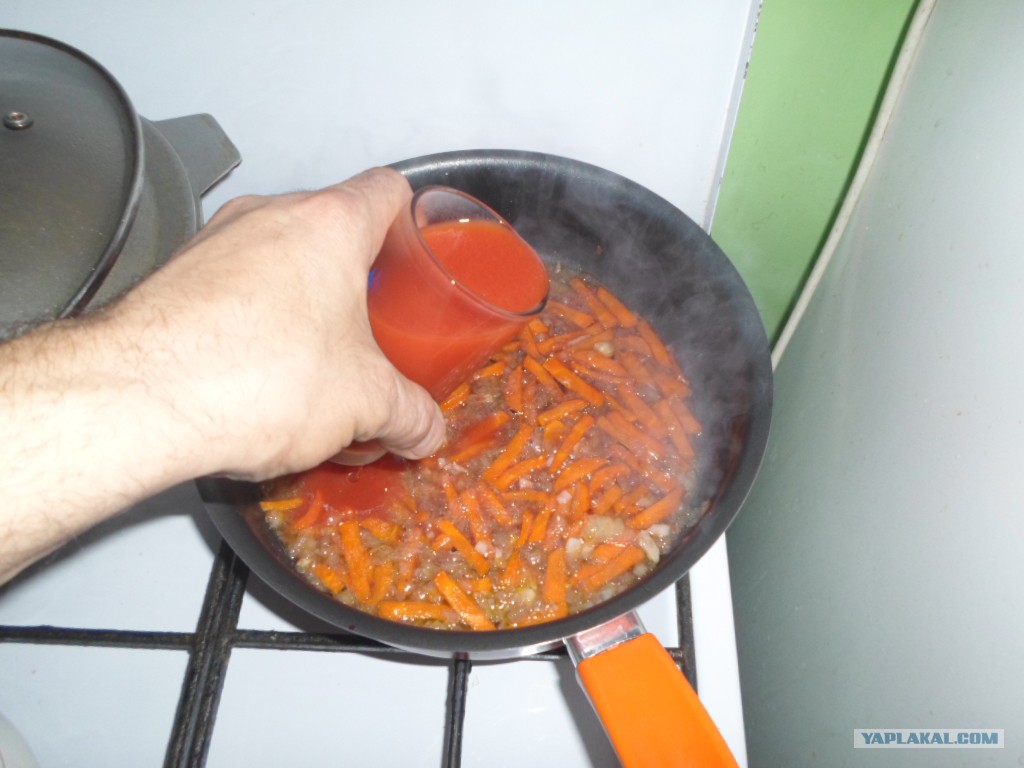 Минут 10 после вина заливаем томатный сок в объеме 400 грамм. И продолжаем далее тушить на медленном огне, ну так 10-15 минут.